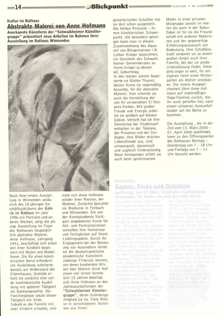 | WZ-Blickpunkt vom 15.03.2000 | Abstrakte Malerei von Anne Hofmann - Ausstellung in Rathaus Winnenden | |